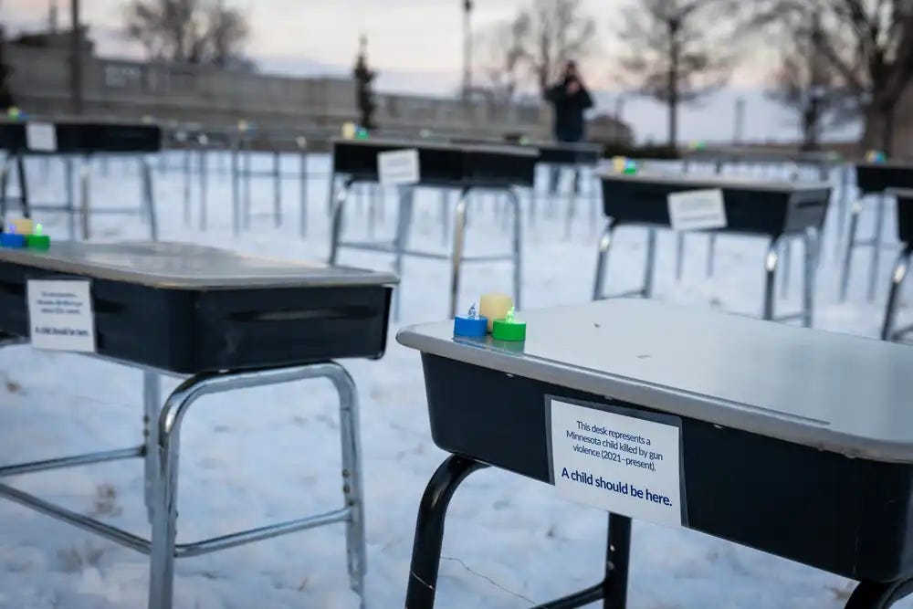 An installation of empty desks, each representing a student who was killed by gun violence in Minnesota since 2021, stands outside the Minnesota State Capitol in St. Paul on Monday. (Photo: Ben Hovland, MPR News).