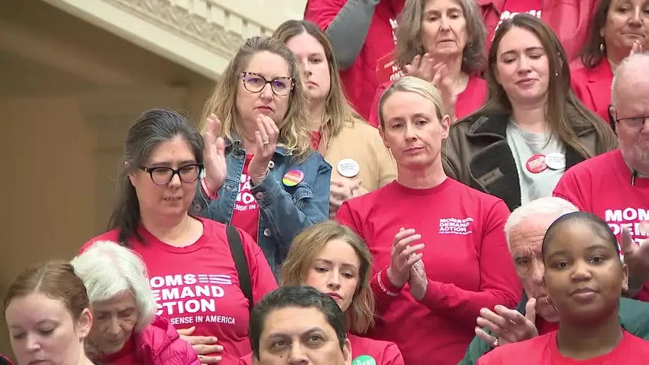 Supporters of “Moms Demand Action” gather at the Georgia State Capitol to advocate for gun safety legislation on February 9, 2026. (via FOX 5 Atlanta)