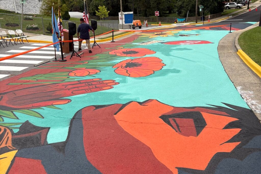 A 124-foot-long anti-gun violence street mural, titled “Streets of Solidarity,” in Colmar Manor, Maryland (WTOP/Kyle Cooper)