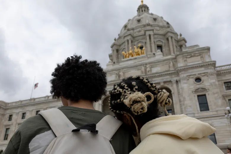 Students who walked out of school lean on each other while rallying for an end to gun violence outside the Minnesota State Capitol on Friday, Sept. 5, 2025, in St. Paul, Minn. (Ellen Schmidt / MinnPost / Catch)