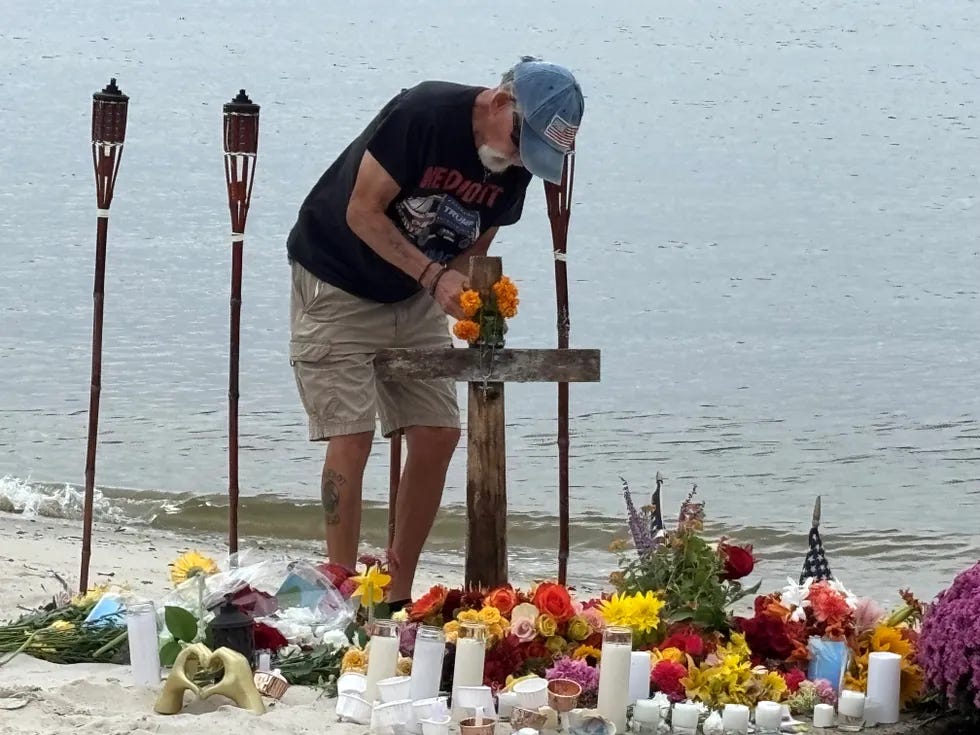 A memorial to victims of the Sept. 27 mass shooting at the American Fish Company in Southport (Bob Liepa; Star News)
