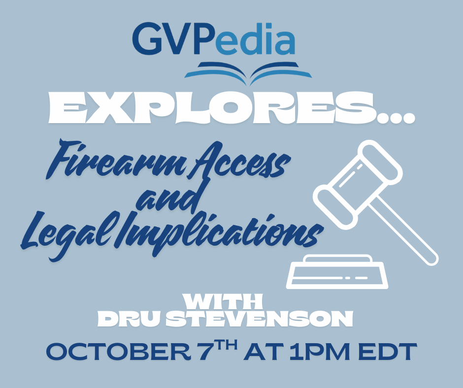 Join us — TODAY Tuesday October 7 at 1pm EDT — for a “GVPedia Explores” virtual session with law professor Dru Stevenson to learn more about the legal implications of firearm access in the U.S.